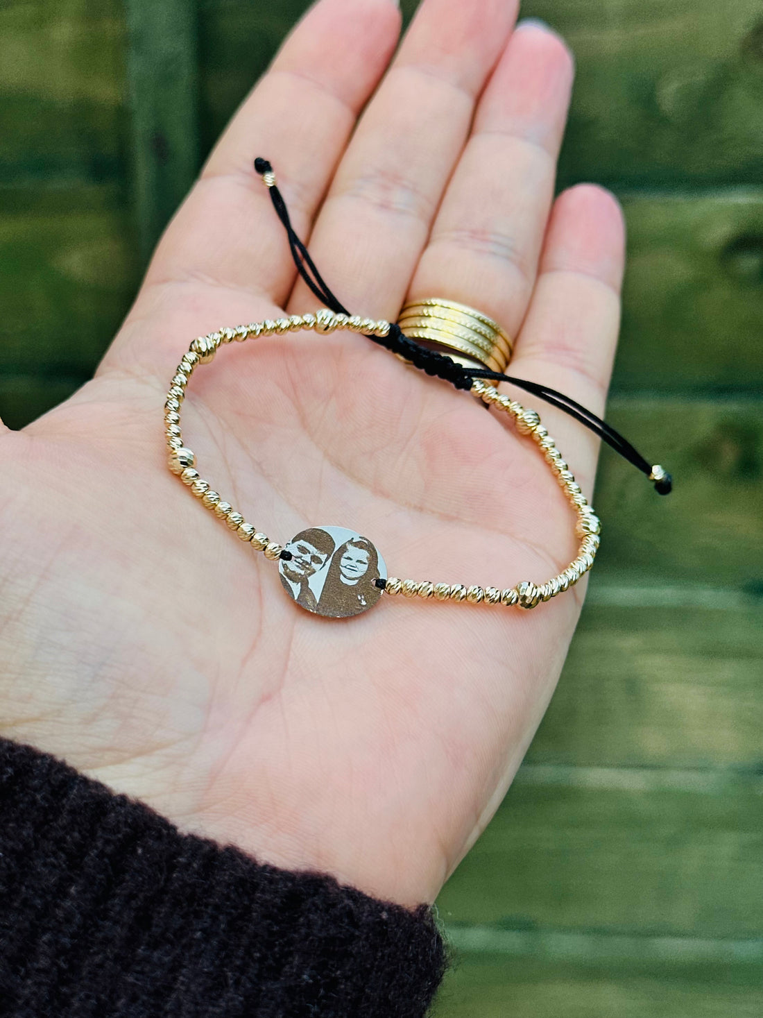 15mm photo coin bracelet +58 beads 2.5mm +6 beads 4mm -14ct gold