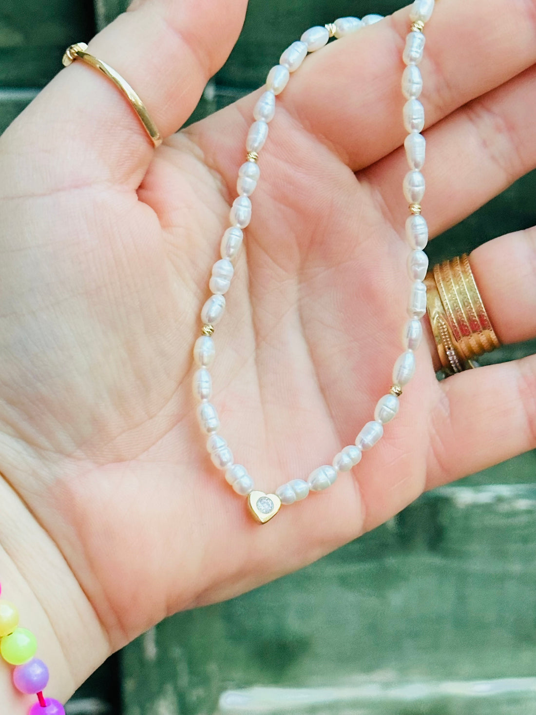 Natural pearl necklace heart + 10 beads 2.5mm -14 ct gold