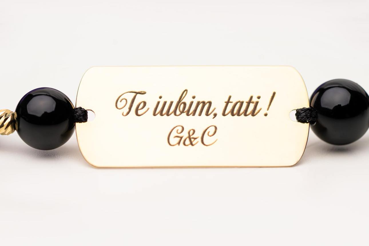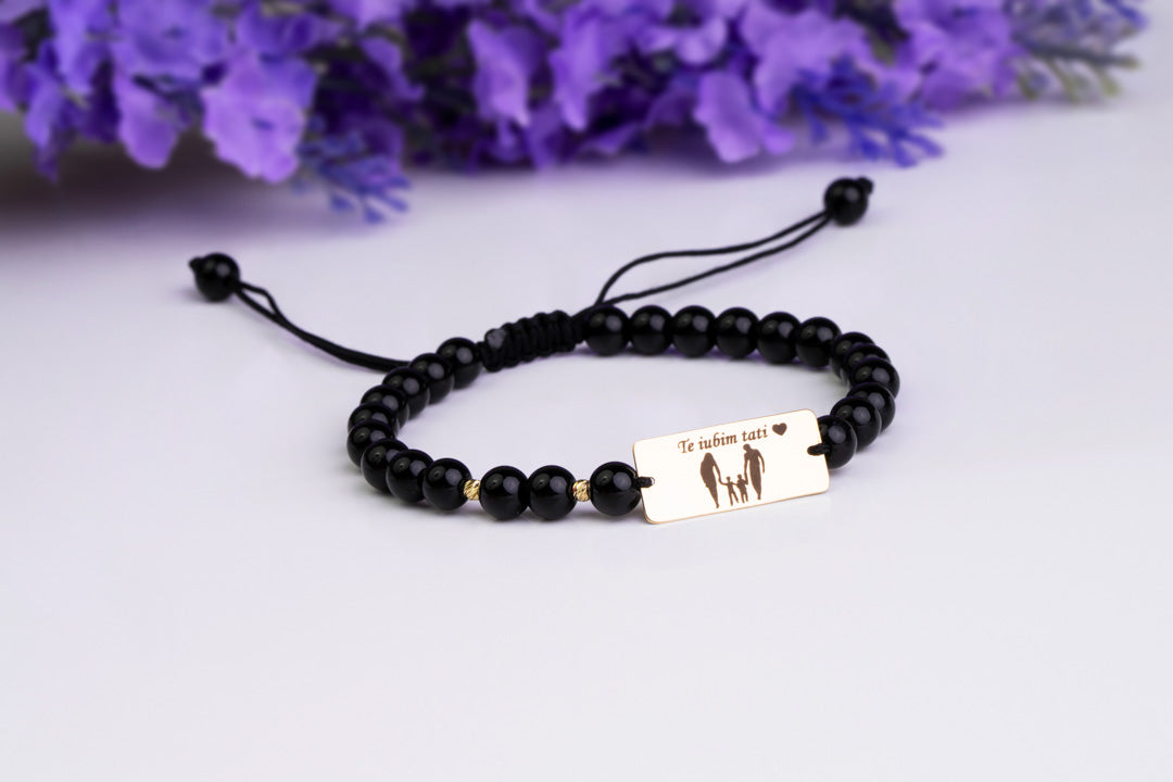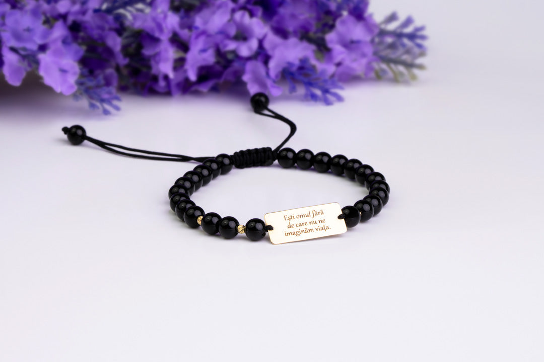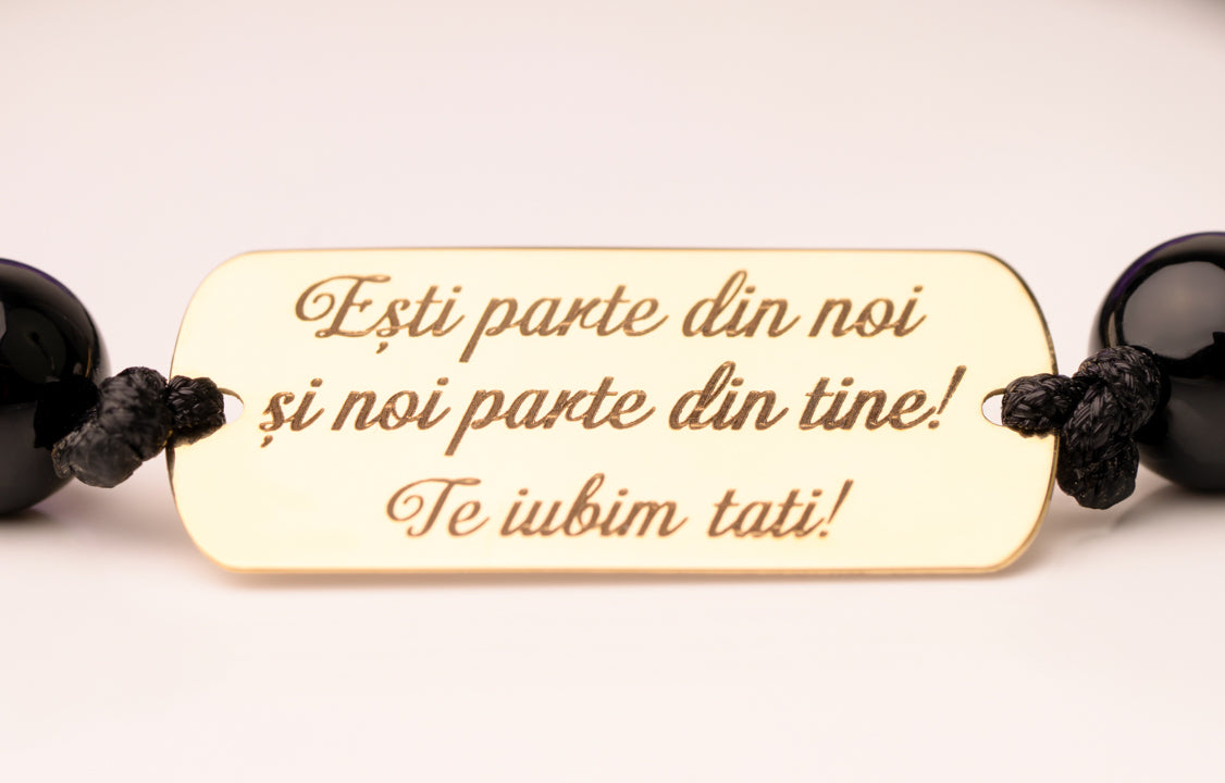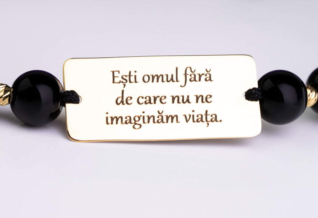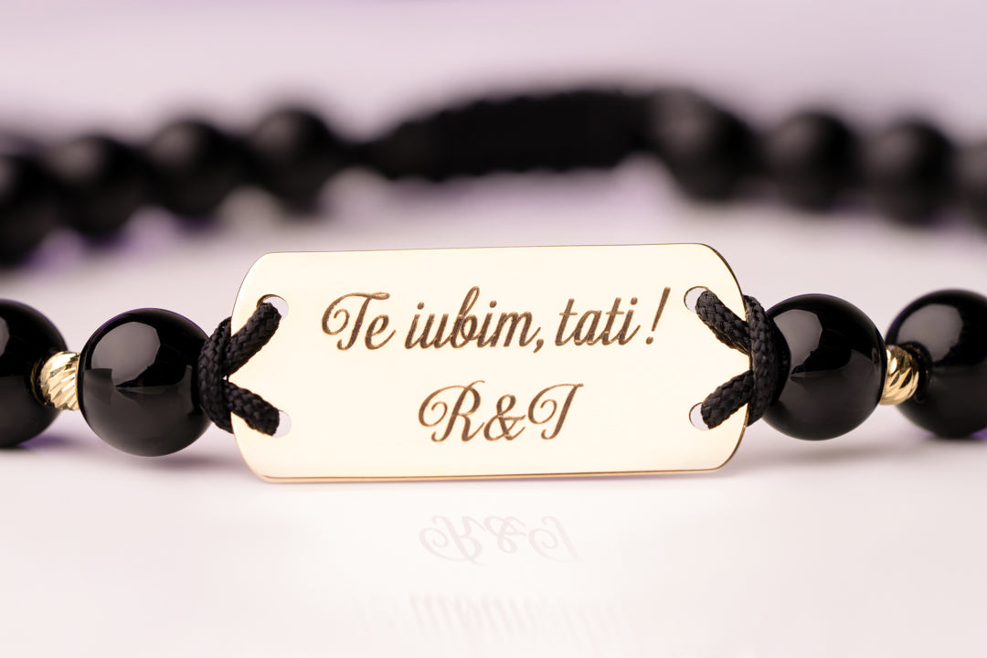 Plate 22/10 engraved + 6 beads 2,5mm + round black beads - 14ct Gold