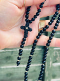 Elegant glossy black beads (6mm) , finished with a hand-woven cross and 14 ct gold beads .